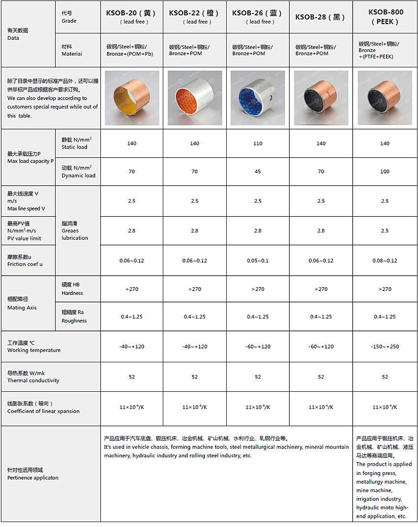 實(shí)際運(yùn)用中根據(jù)使用環(huán)境、工況和環(huán)保要求的不同,表面塑料層POM/PEEK 里可以添加不同的填充材料。產(chǎn)品范圍包括:KSOB-20(黃)、KSOB-22(橙)、KSOB-26(藍(lán))、KSOB-28(黑)、KSOB-800(PEEK)。